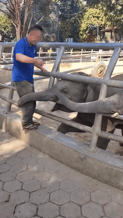 网友拍摄的这段视频泄露,在一处动物园中,两只小象将鼻子伸出围栏讨要食品,别称身穿蓝色上衣的男人站在围栏旁,手上拿着一把金属锁。其中一只小象的鼻子碰到了男人的腿,男人挥动金属锁用力向小象头部砸去,同期大声呵斥,小象向后退了几步又伸出鼻子,男人再次挥锁砸向小象。
